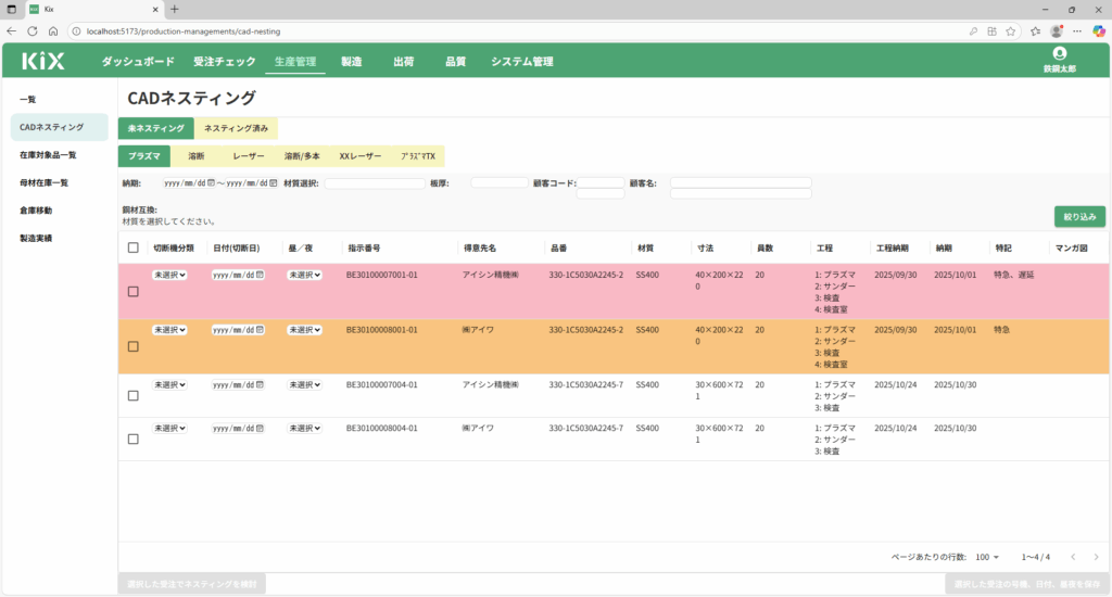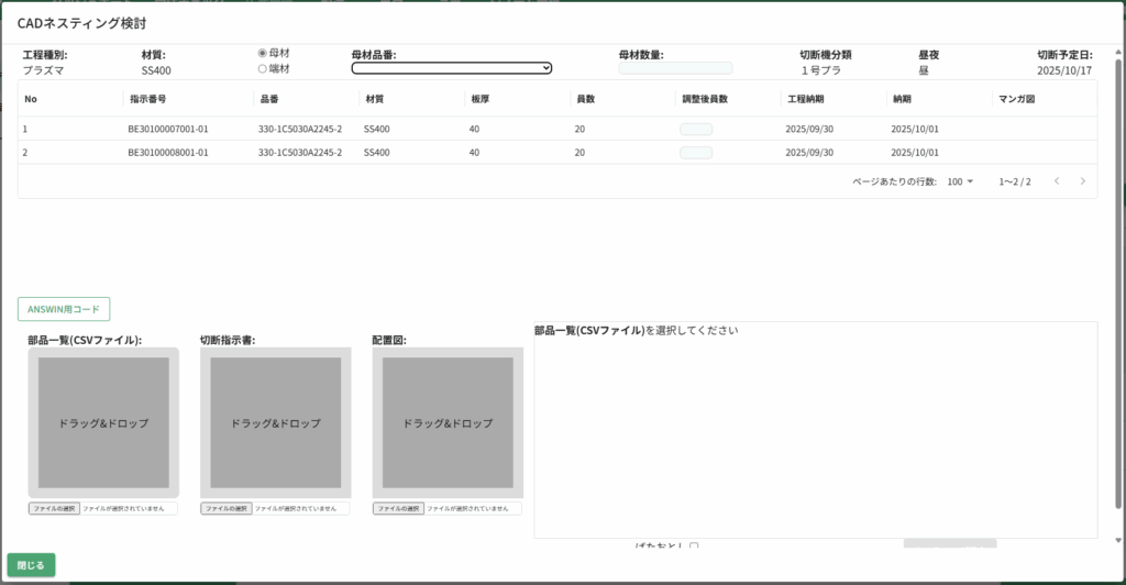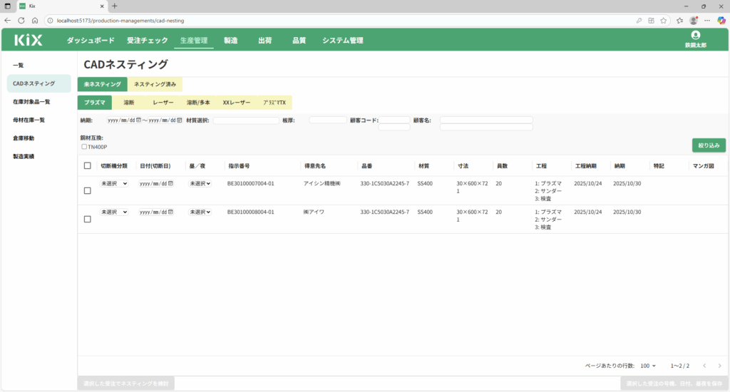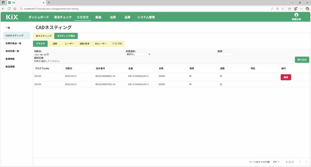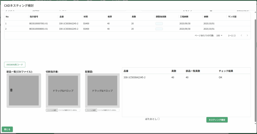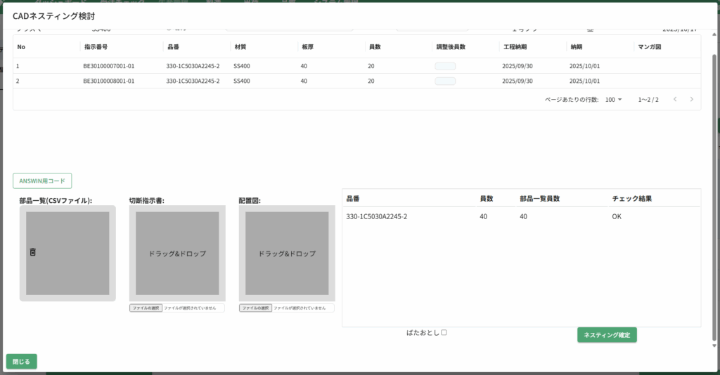CADネスティングデータの登録、確定を実施します。また、ネスティング済み受注の閲覧・解除ができます。