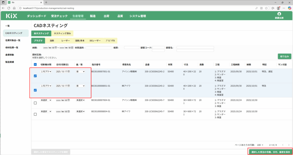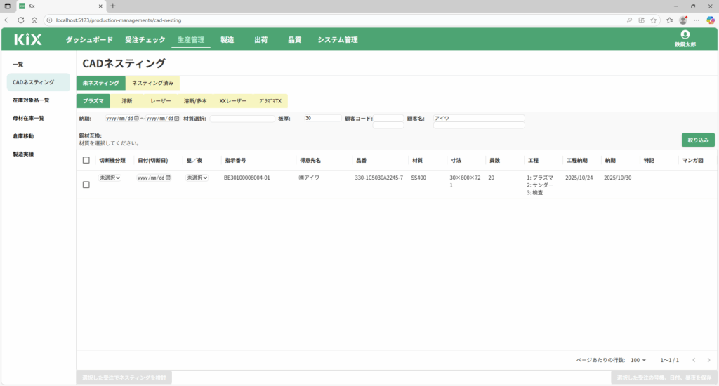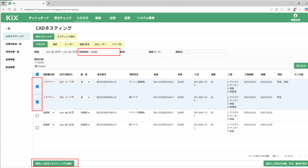 絞り込み条件の「材質選択」で絞り込みをしたうえで、表のチェックボックスを選択すると「選択した受注でネスティングを検討」ボタンが押せるようになります。同一のプログラムNo.でネスティングする行を選択して、ボタンを押してください。