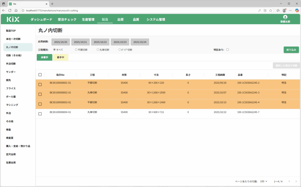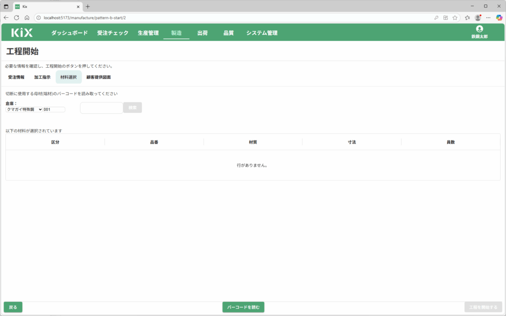 丸ノ内切断の工程について、材料を選択し、工程開始~完了を行います。