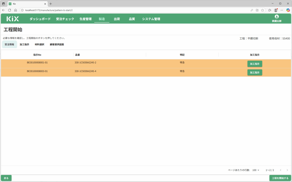 「選択した受注で切断」ボタンを押すと、「工程開始」画面に変わります。