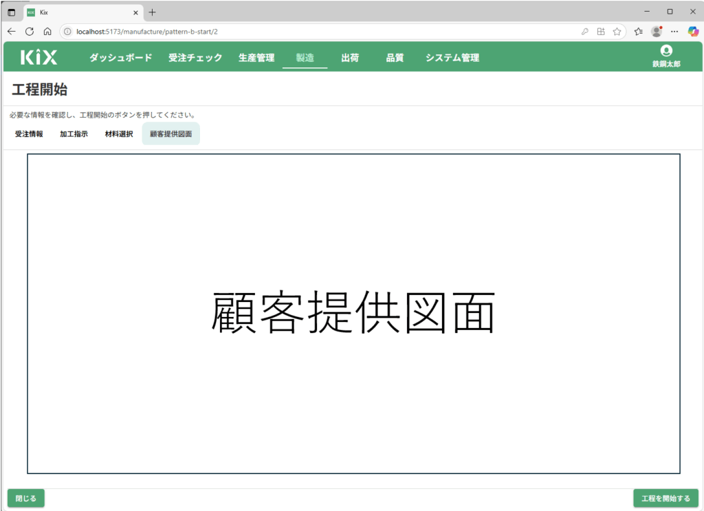 「工程開始」画面のいずれかのタブで「工程を開始する」ボタンを押すと、「工程完了画面」に移ります。