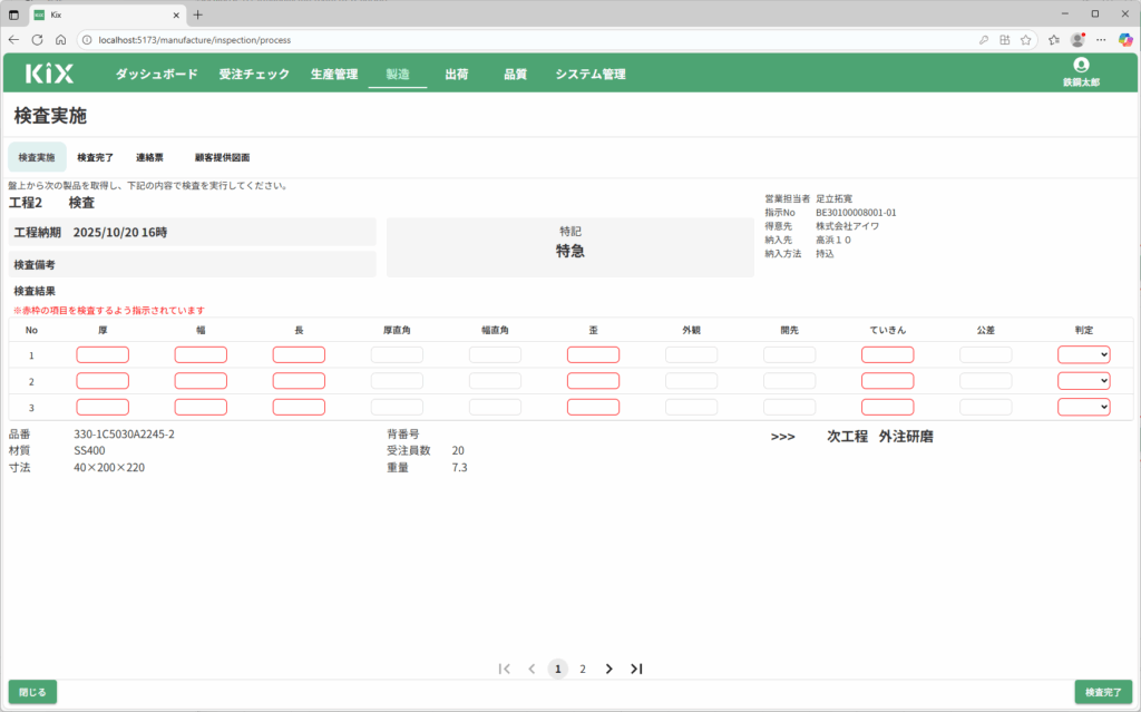 工程完了画面に表示されているすべての指示No.について完了すると、自動的に「検査実施」画面に移ります。