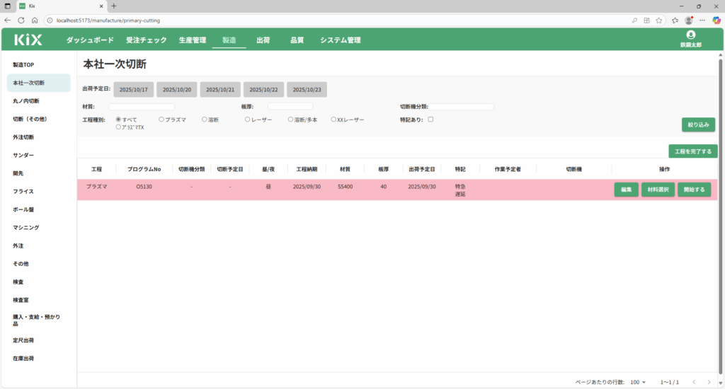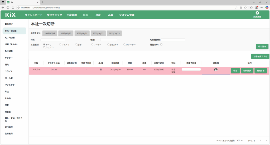 本社一次切断画面には、ネスティングが完了したプログラムNo.単位で表示されます。「生産管理>CADネスティング」事前にネスティングを実施してください。