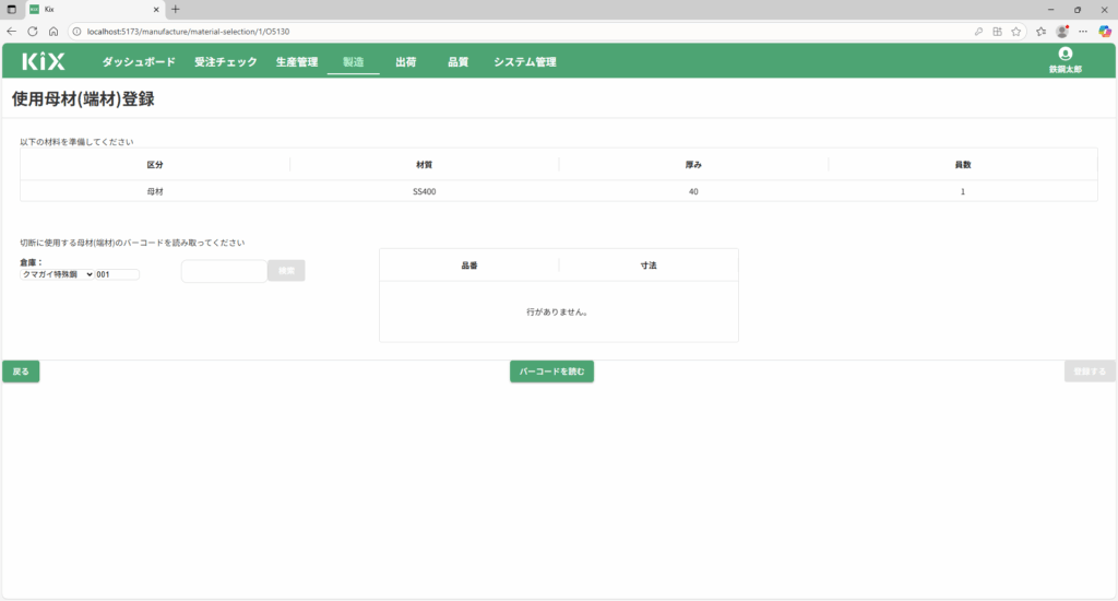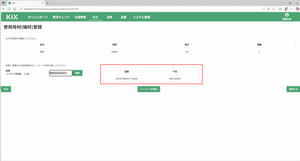 読み取った母材(端材)の情報が表示されます。内容を確認し、「登録する」ボタンを押してください。