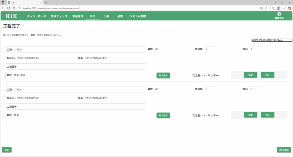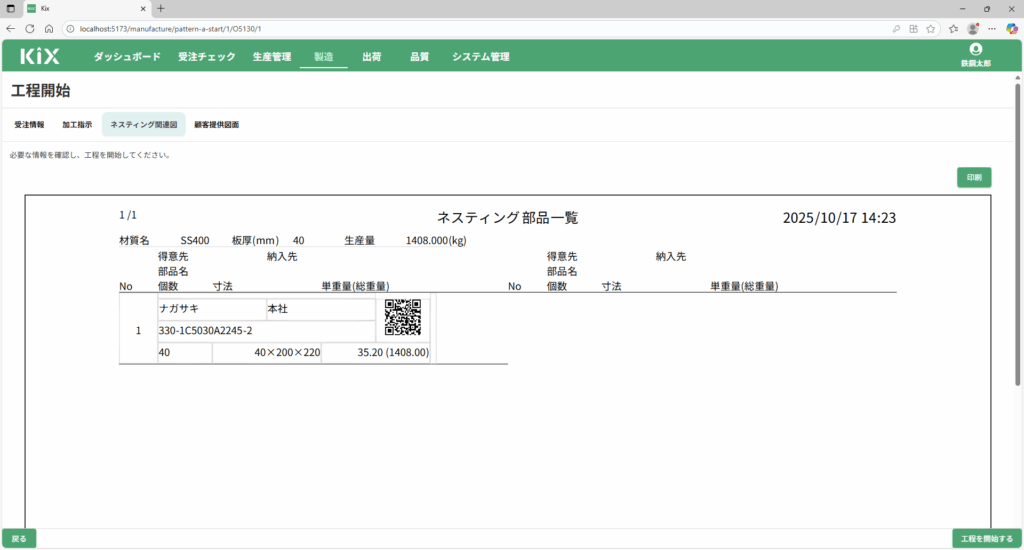 ネスティング部品一覧のQRコードを読み込むと、完了対象のデータが追加されます。