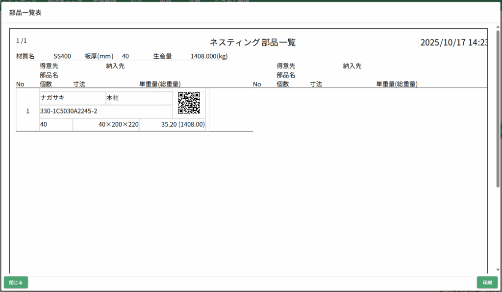 「部品一覧」ボタンを押すと、「ネスティング部品一覧」が表示されます。