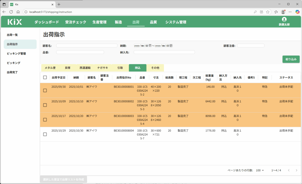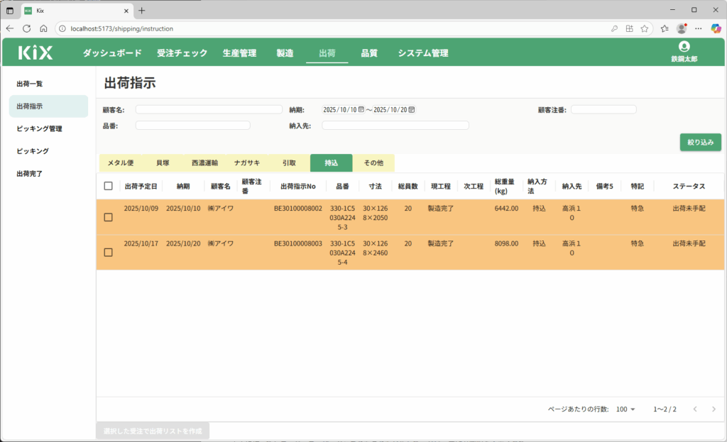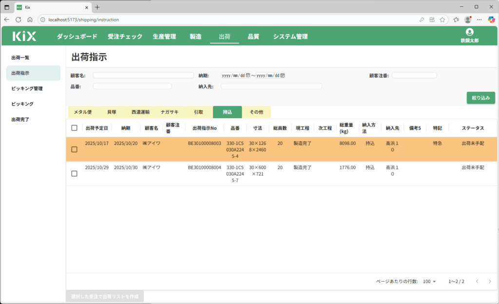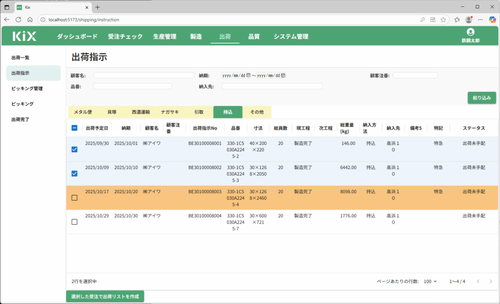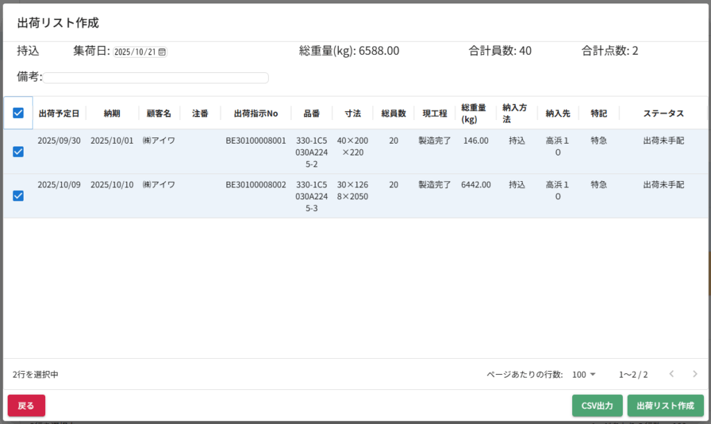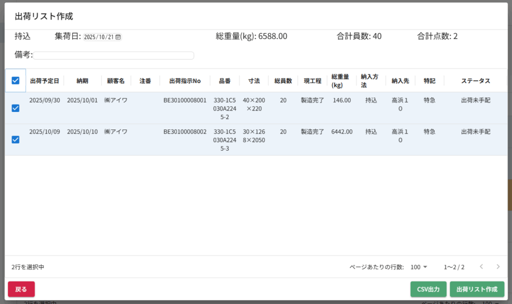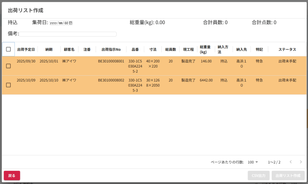 チェックを入れると、「CSV出力」「出荷リスト作成」ボタンが押せるようになります。また、チェックした行の「総重量」「合計員数」「合計点数」が計算されます。