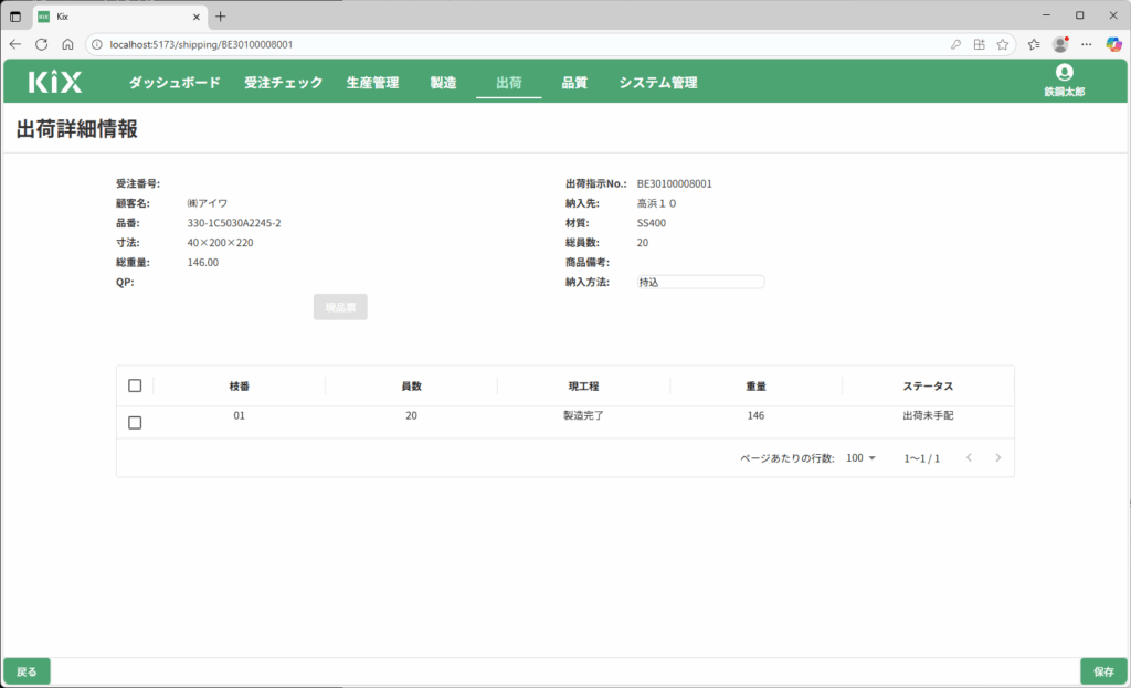 一覧の行をクリックすると、出荷詳細情報画面に変わります。