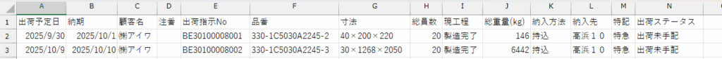 「CSV出力」ボタンを押すと、CSVファイル(shipment_list_.csv)をダウンロードできます。