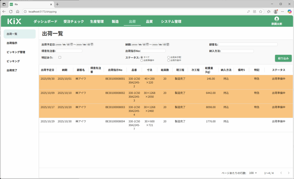 また、ピッキングリストに追加した出荷指示No.は、出荷一覧画面ではステータスが「出荷準備中」に変わります。
