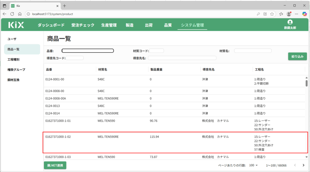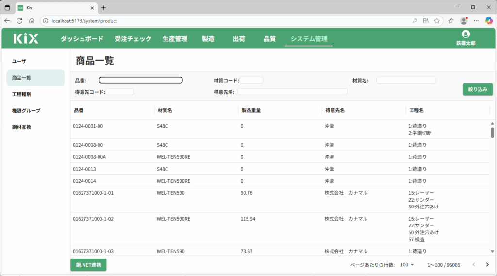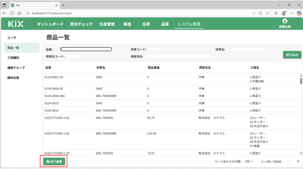 「鋼.NET連携」ボタンを押すことで、鋼.NETの品番マスタの情報をKIXに反映します。