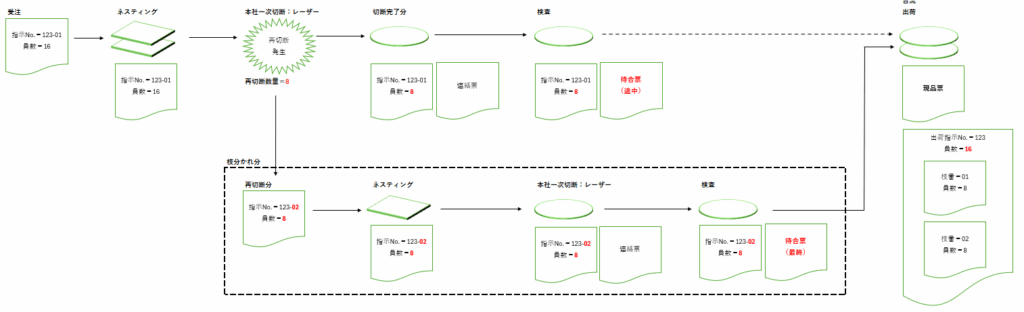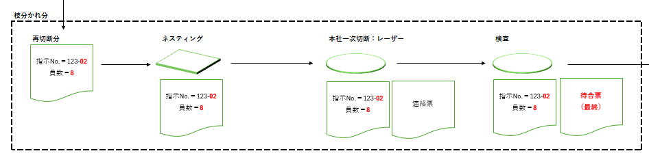 再切断分については、指示No.の下2桁(枝番)の値が1つ増え、切断完了分とは区別されます。これを枝分かれと言います。