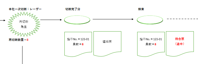ここでは、「第1工程:レーザー 第2工程:検査」の受注で、第1工程で再切断が発生した場合を例に挙げます。