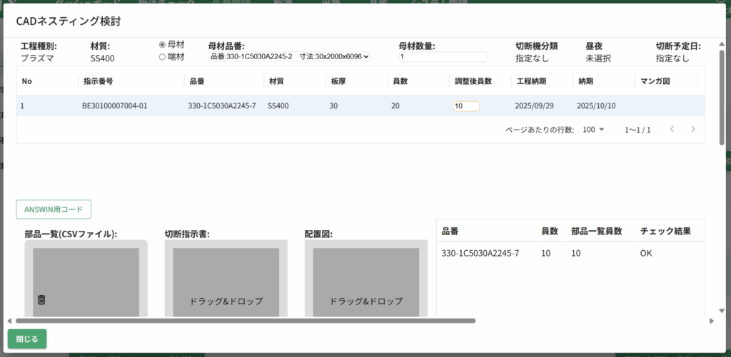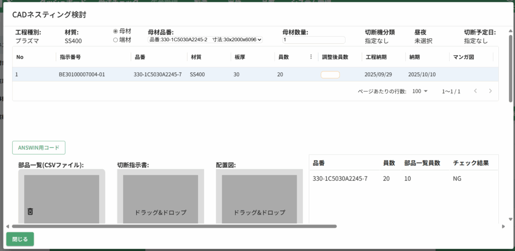 CADネスティング検討において、部品一覧(CSVファイル)に記載されている員数が、受注データの員数より小さいとき、チェック結果が「NG」となります。