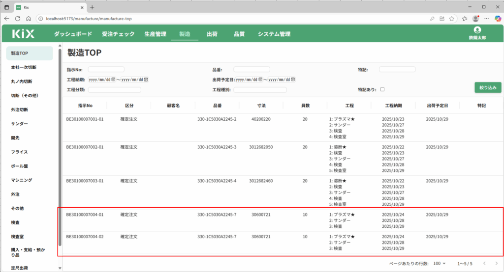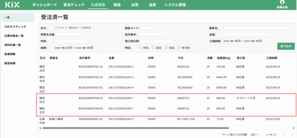 ダッシュボード画面に表示されるようになり、「受注済一覧」「製造TOP」といった一覧画面では、背景色がオレンジ色になって表示されます。