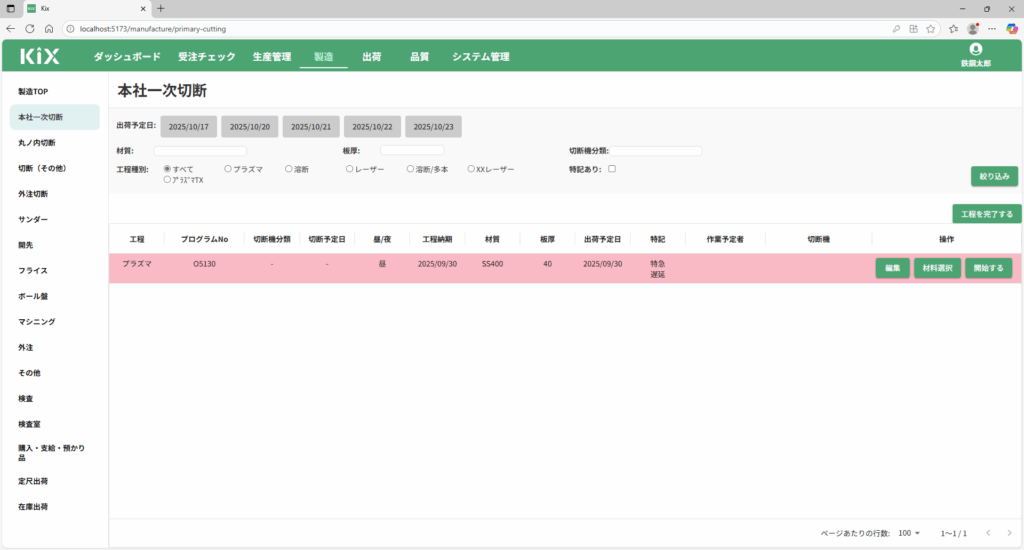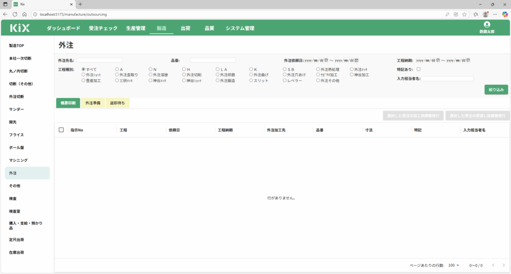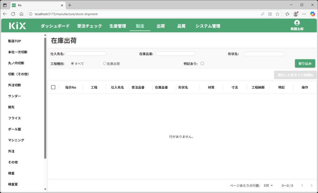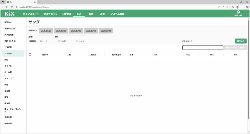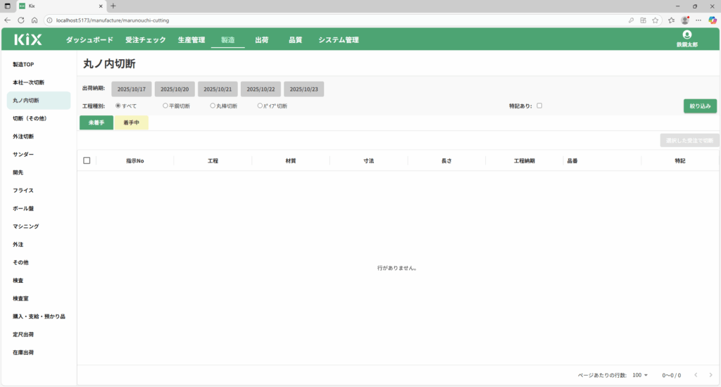 「製造」をクリックした直後は、「製造TOP」画面が表示されます。画面左のメニューに工程種別が表示されています。